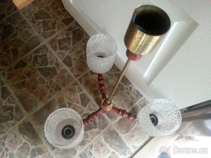 Prodám tříramenný lustr - kombinace sklo/dřevo/kov, délka - 75 cm.