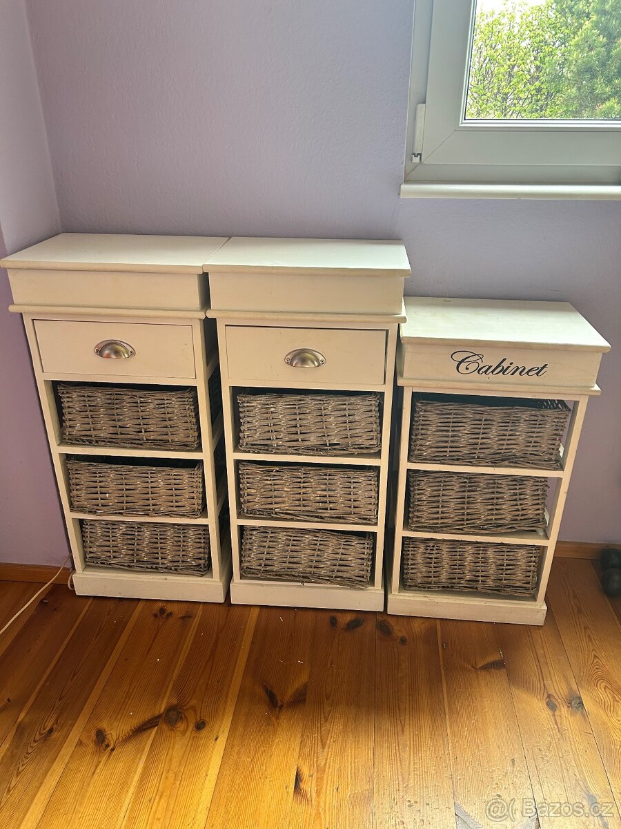 Prodám sadu tří dřevěných komod/šuplíkových skříněk s proutěnými košíky, používané, běžné známky opotřebení
