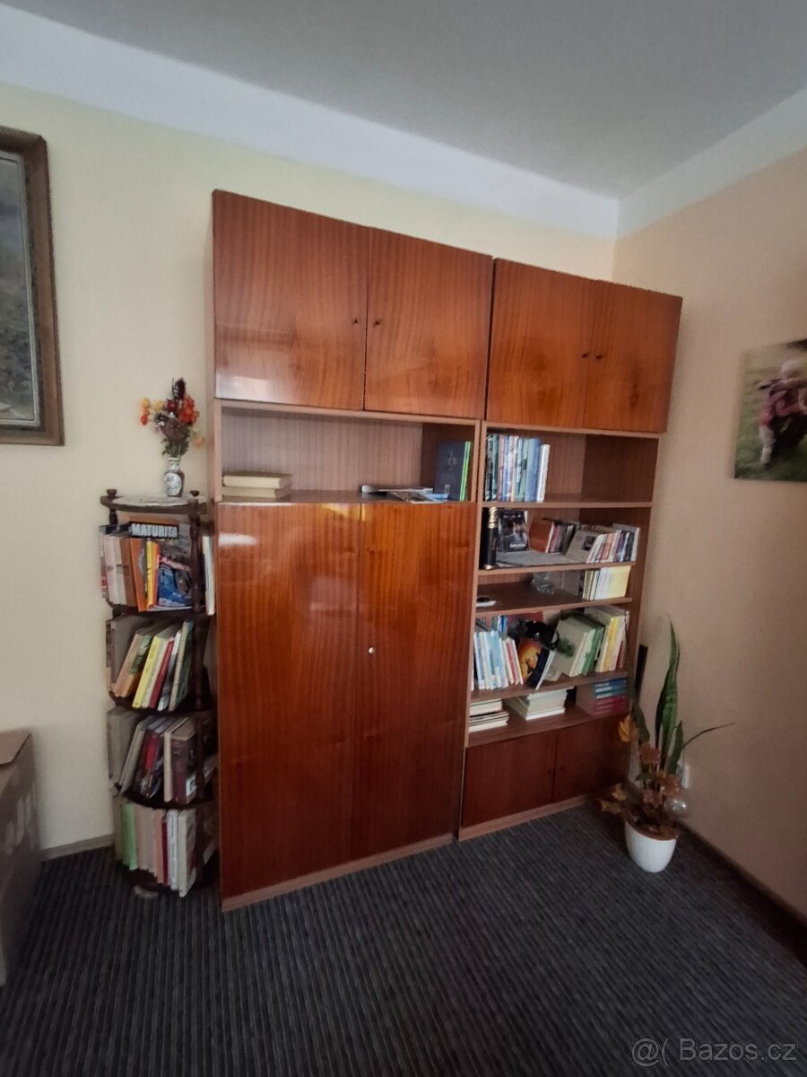 Obývací stěna - [23.4. 2026]Nabízím starší obytnou stěnu z lamina v dobrém stavu. Š 202 cm V 157 Hloubka 55 u paty 43 cm nahoře. Ve smontovaném stavu se nevejde do výtahu a po schodech by se asi taky nevytočila (5.patro), nutné rozebrat.