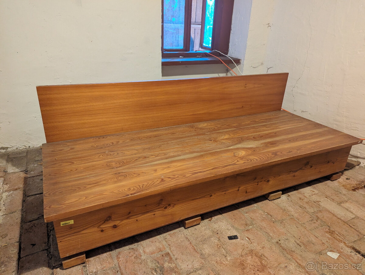 Prodám gauč z masivu a dýhové spárovky. Gauč má opěradlo a hlavní část, která je dutá. Lze ji otevřít, uvnitř je úložní prostor.