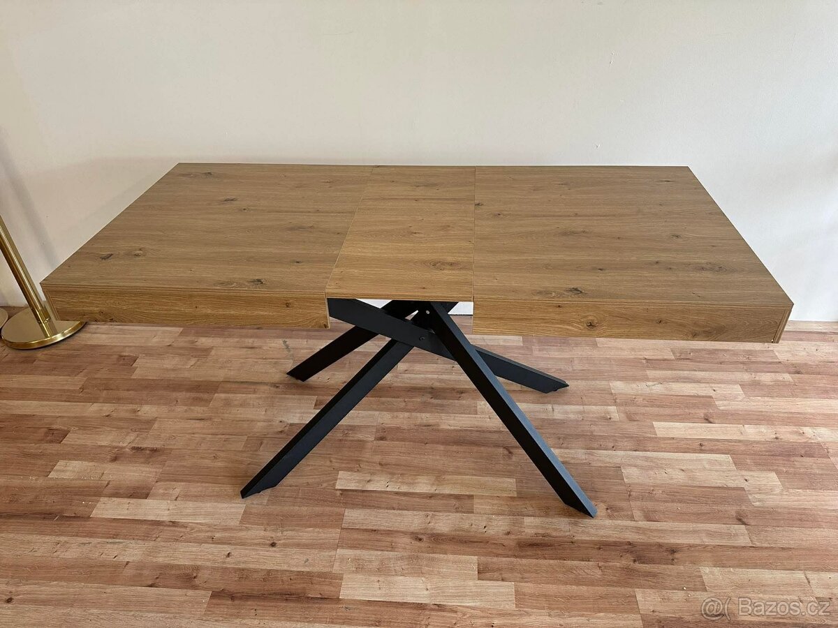 Prodám moderní rozkládací jídelní stůl v dekoru dřeva s černou kovovou podnoží. Stabilní a pevná konstrukce, vhodný do moderního interiéru.