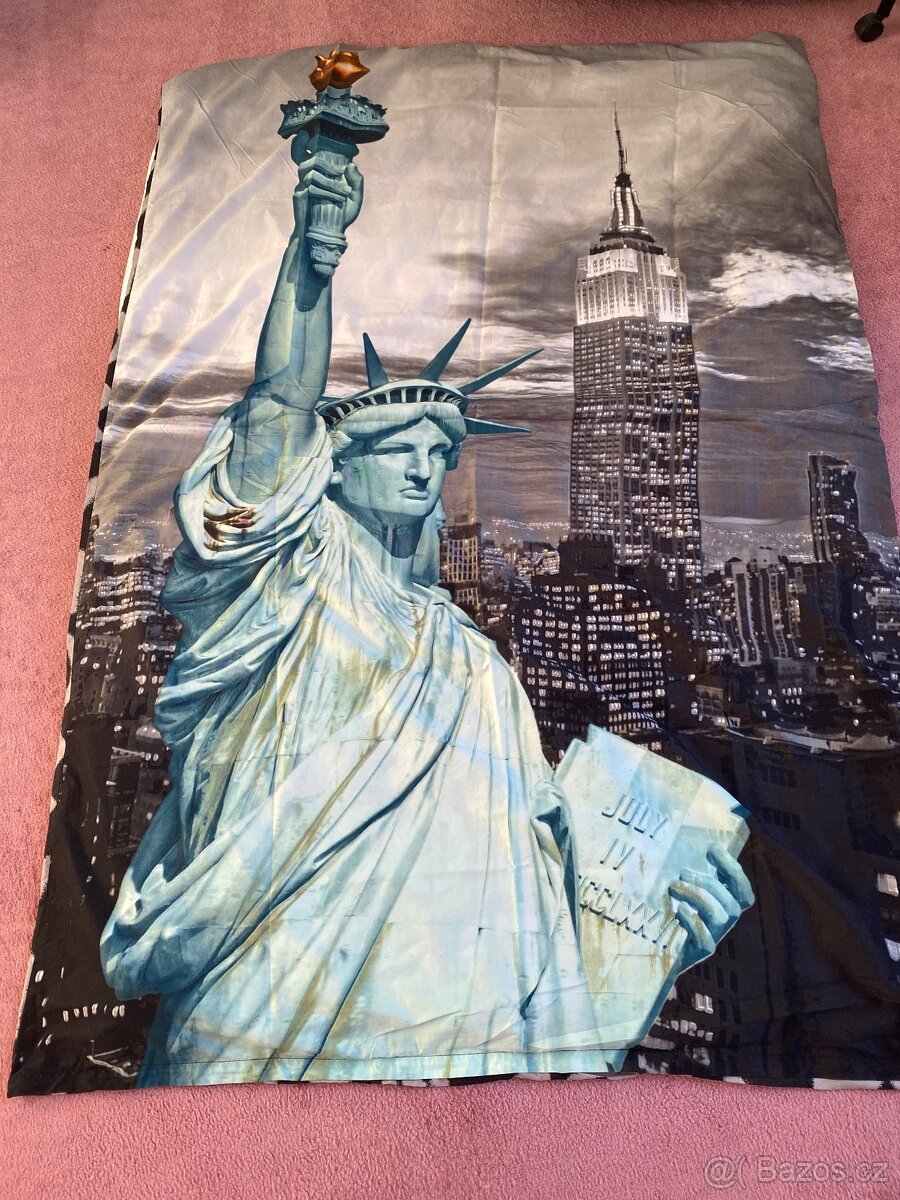 Bavlněný sa ten klasický rozměr. Povlečení na dvě lůžka, Zakoupené v Německu, zapínání na zip povlečení New York socha svobody. první dvě fotografie je povlak na deku Z obou stran, 3. fotografie povlak na polštář z jedné i z druhé strany