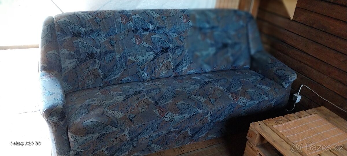 Daruji za lahev vina vybavení chaty, rozkladaci gauč, dvou a tři místní gauč, stolek z palet, police, skříňka se zrcadly.