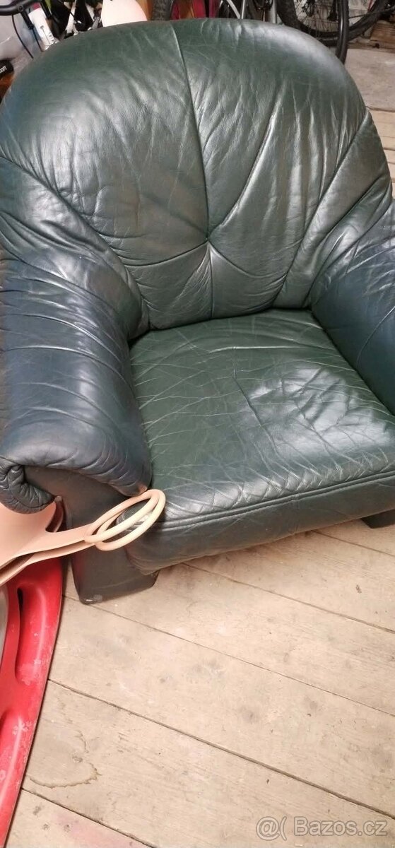 Prodám použité zelené kožené křeslo, kvalitní.