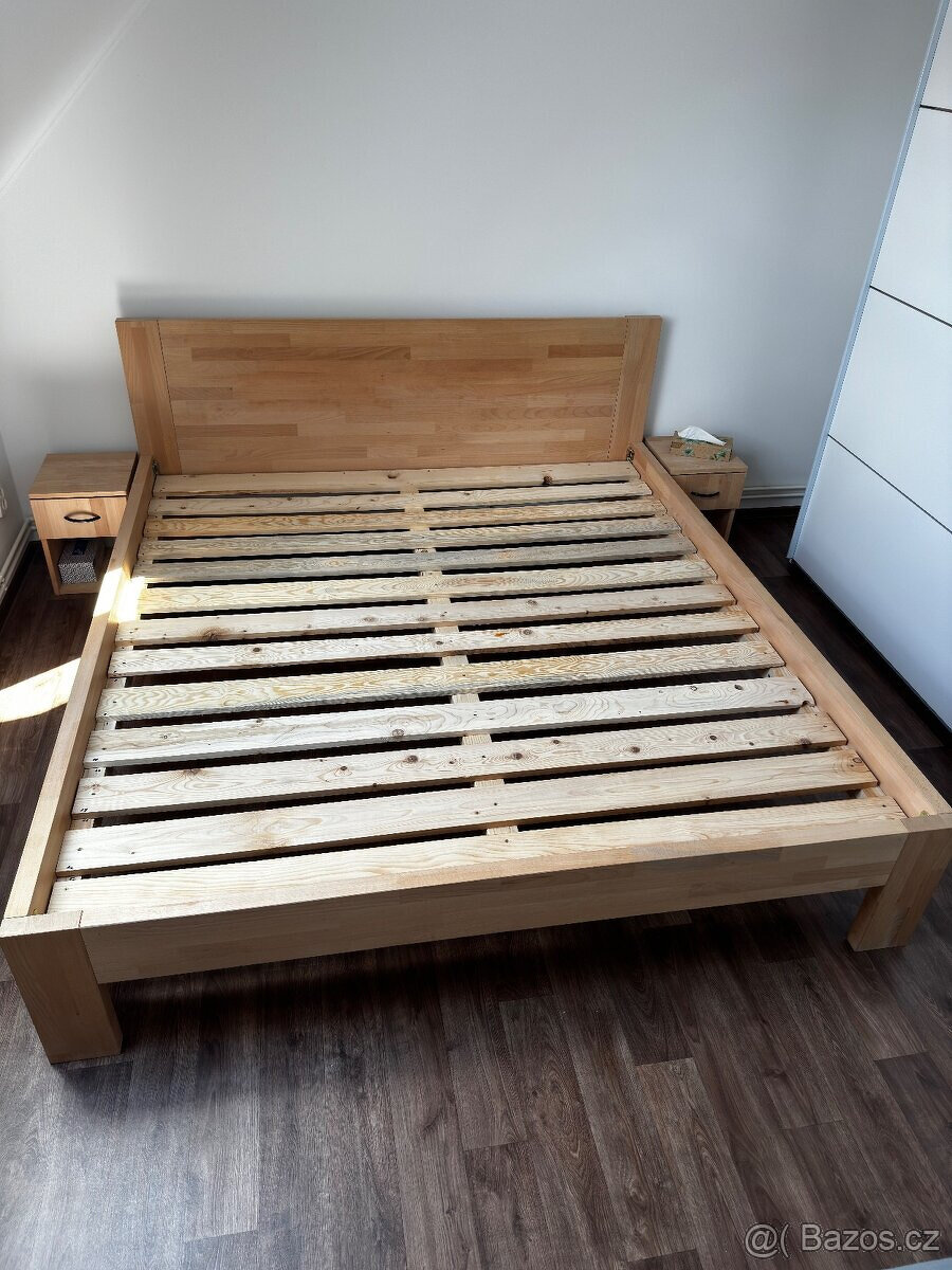 Prodám od truhláře postavenou postel 180x200 cm. Když se sundají rošty, tak se postel rozloží na 4 díly žádné vrtání, strany se do sebe zasouvají. Je jako nová, nic ji není.K tomu matrace 2*90cm používané 1 rok. A 2 šuplíky pod postel.