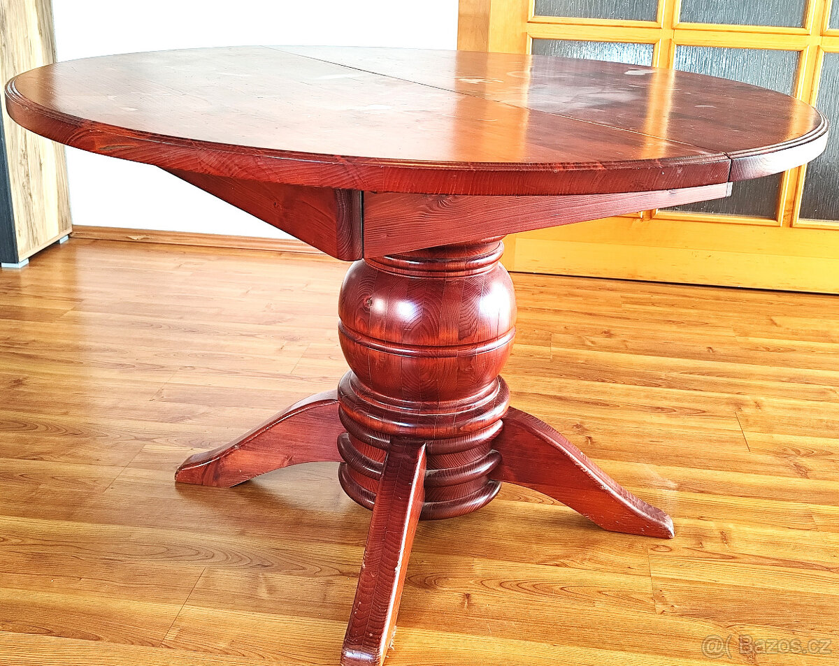 Prodám masivní stůl v barvě mahagonu, který je ideální pro každou domácnost nebo kancelář. Stůl je složený, kulatý o průměru 120 cm a po rozložení má rozměry 160x120 cm. Výška stolu je 75 cm.