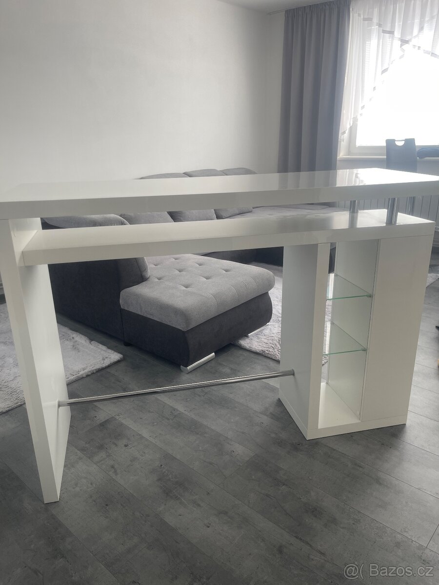 Barový stůl v bílém lesku. Délka 157cm, šířka 55cm. Pouze osobní odběr.