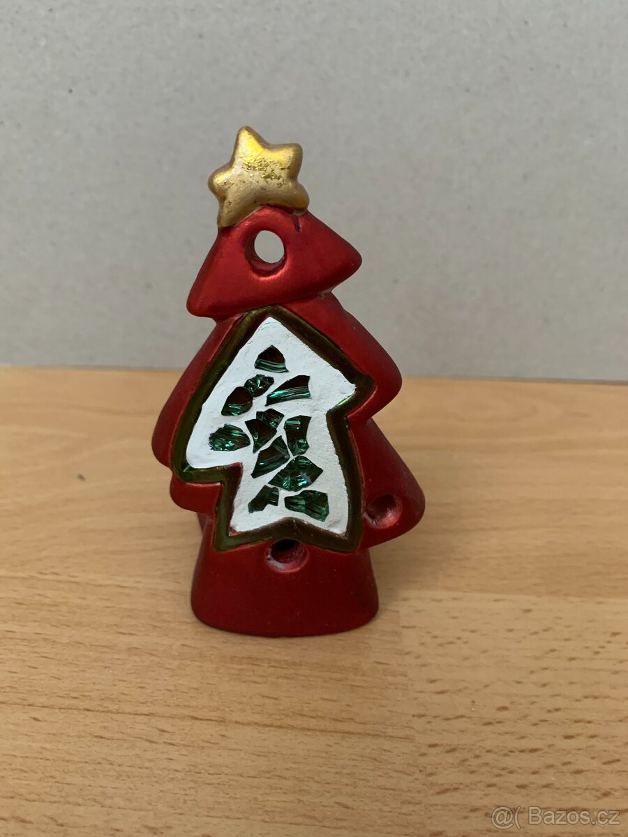 Keramický svícen červený s motivem vánočního stromečku na čajové svíčky.