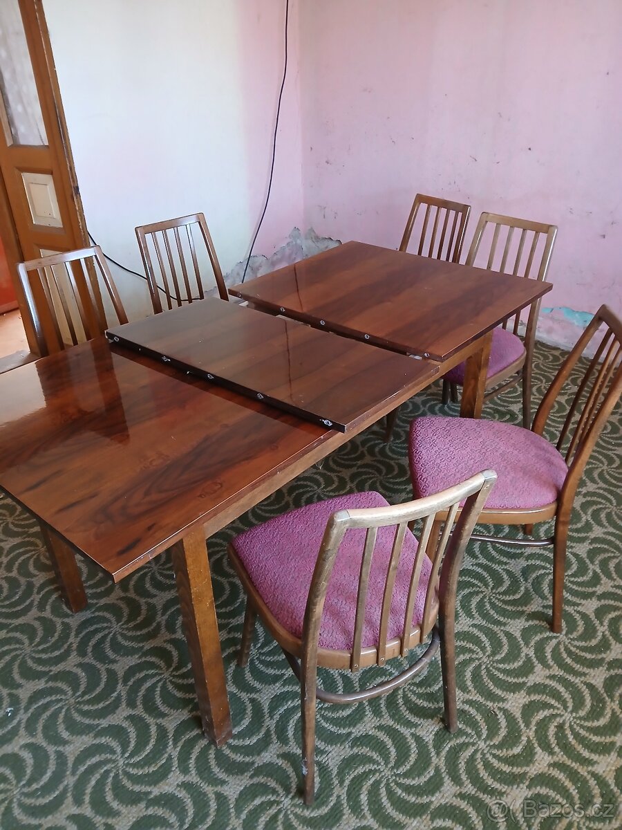 Nabízím zachovalý, pevný, rozkládací stůl + 6 židlí.