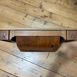 Šicí stroj v původní dřevěné skříňce se šuplíky. Stroj ve skříňce je funkční