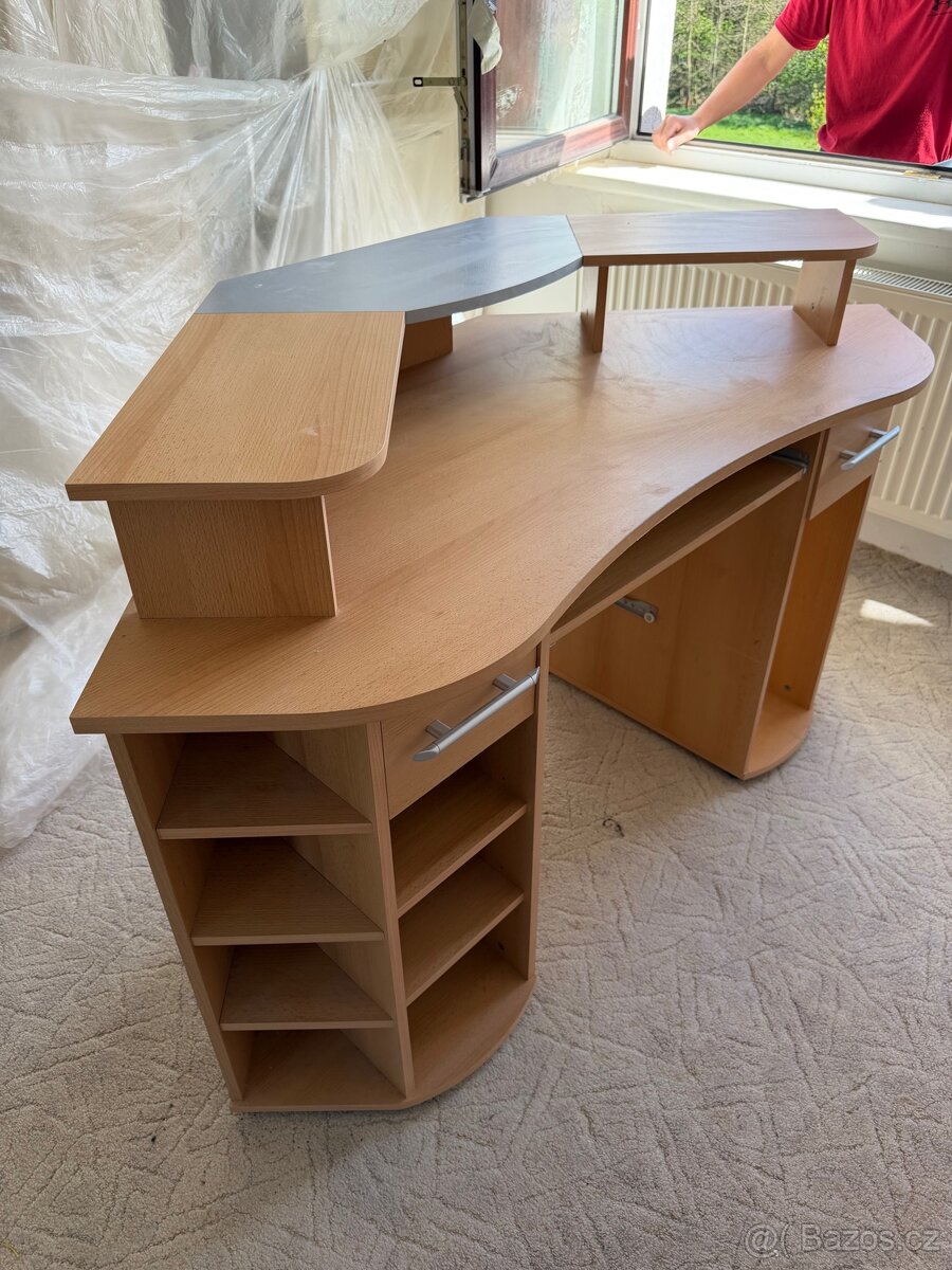 Rohový kancelářský stůl - [23.4. 2026]Rohový herní PC stůl, ve velmi dobrém stavu, zespodu desky 4 zásuvky.