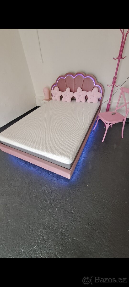 Růžová čalouněná postel140 cm, led podsvícená, matrace 25cm,140x200 s paměťové pěny plus doplňky, vše nové
