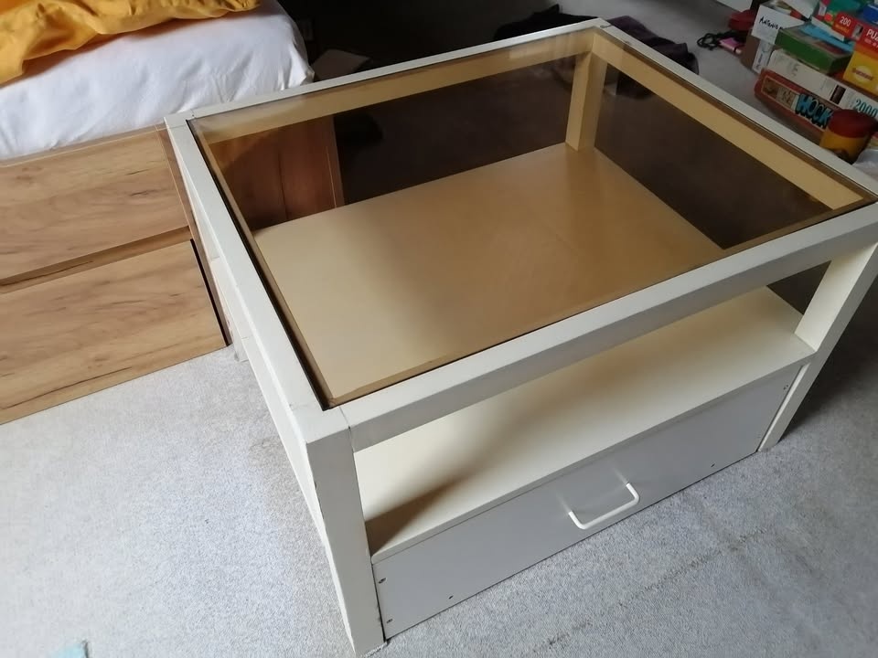 Dřevěný, prosklený stolek s kouřovým sklem a se šuplíkem. Šuplík není původní, je dodělán kvůli úložnému prostoru. Levně.