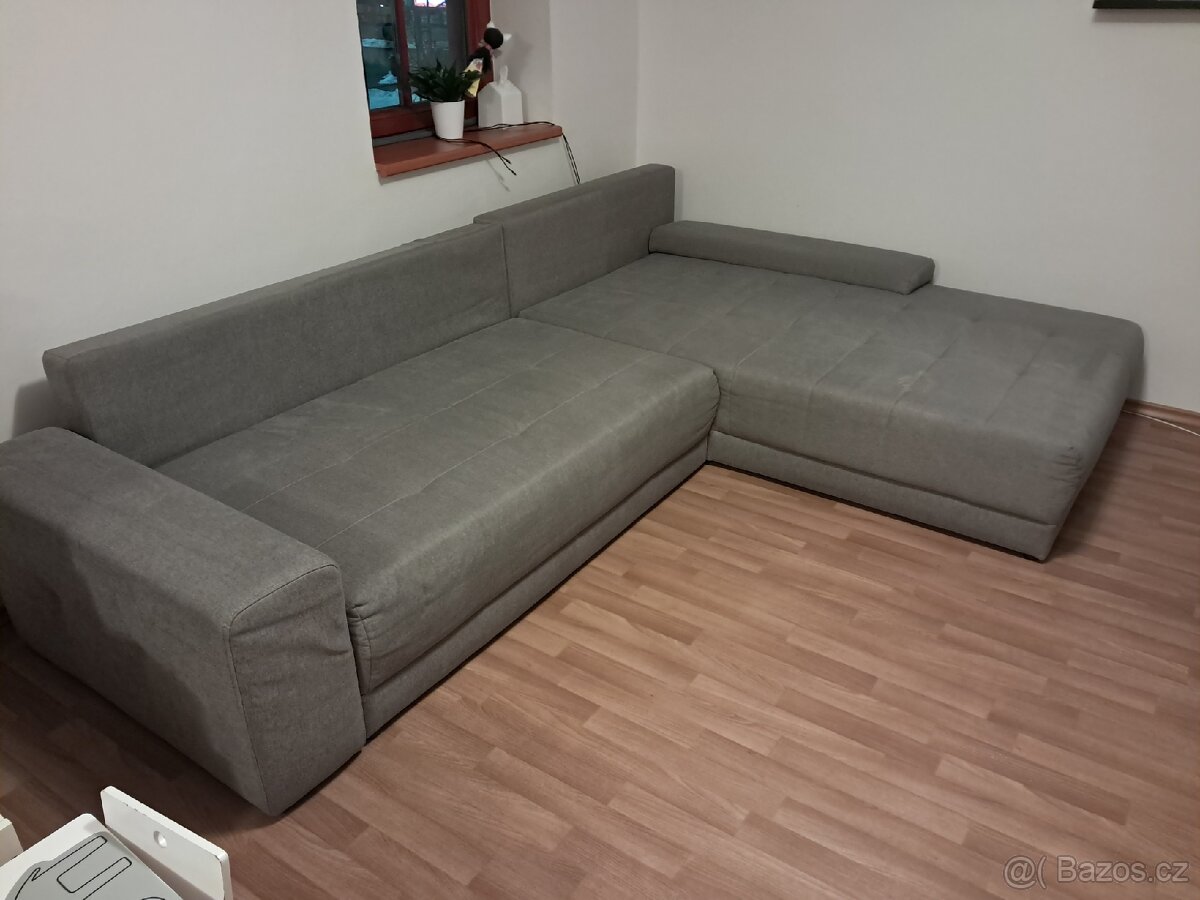 Prodám rohovou sedací soupravu, rozkládací s úložným prostorem, šedivá barva, použivaná 3 roky, 306x210x130 cm