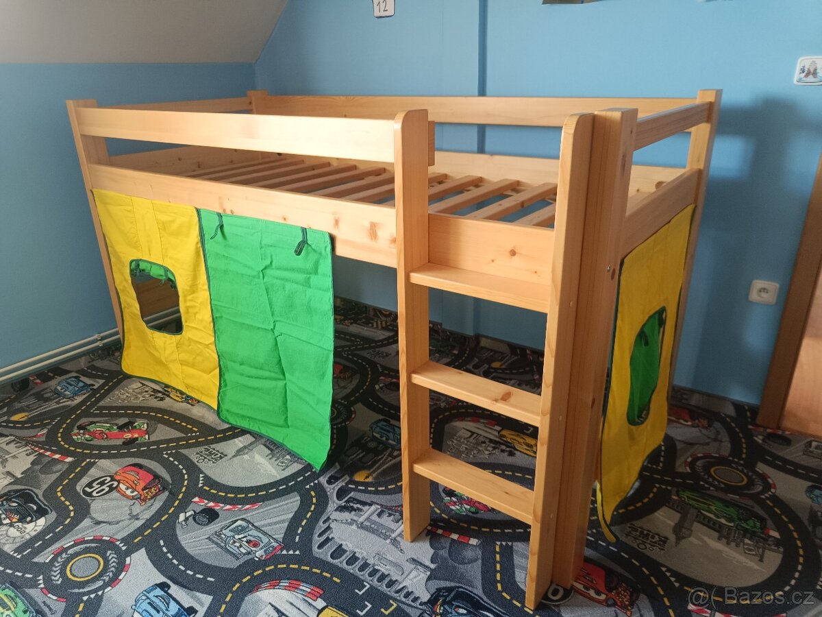 Postel vyvýšená - [6.4. 2026]Dětská postel vyvýšená z borovicového dřeva. Zachovalá, nepočmáraná ani nepolepená. Má schody a přidavnou klouzačku. Je možné dát v pravo I v levo. Součástí je latkovy rošt, přídavný tunel a závěsy na suchý zip.