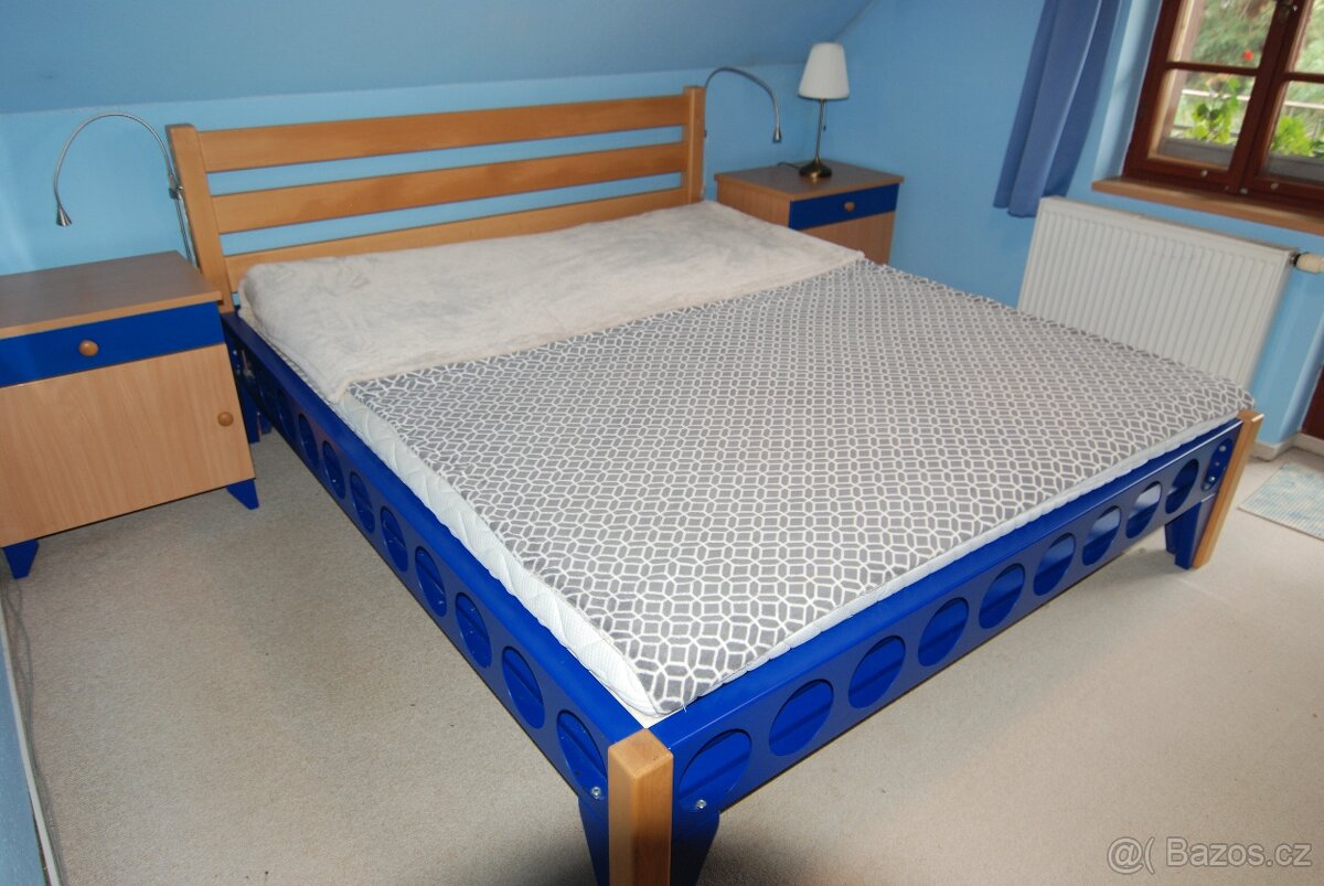 Prodám velkou postel (2x2,4m), vyrobená na zakázku, kombinace kov a bukové dřevo. Absolutně pevná. Na podkladních dřevěných roštech jsou originál rošty VALTY. Bez svrchní matrace. Postel má na obou stranách stavitelné LED čtecí lampičky. Včetně dvou nočních stolků.