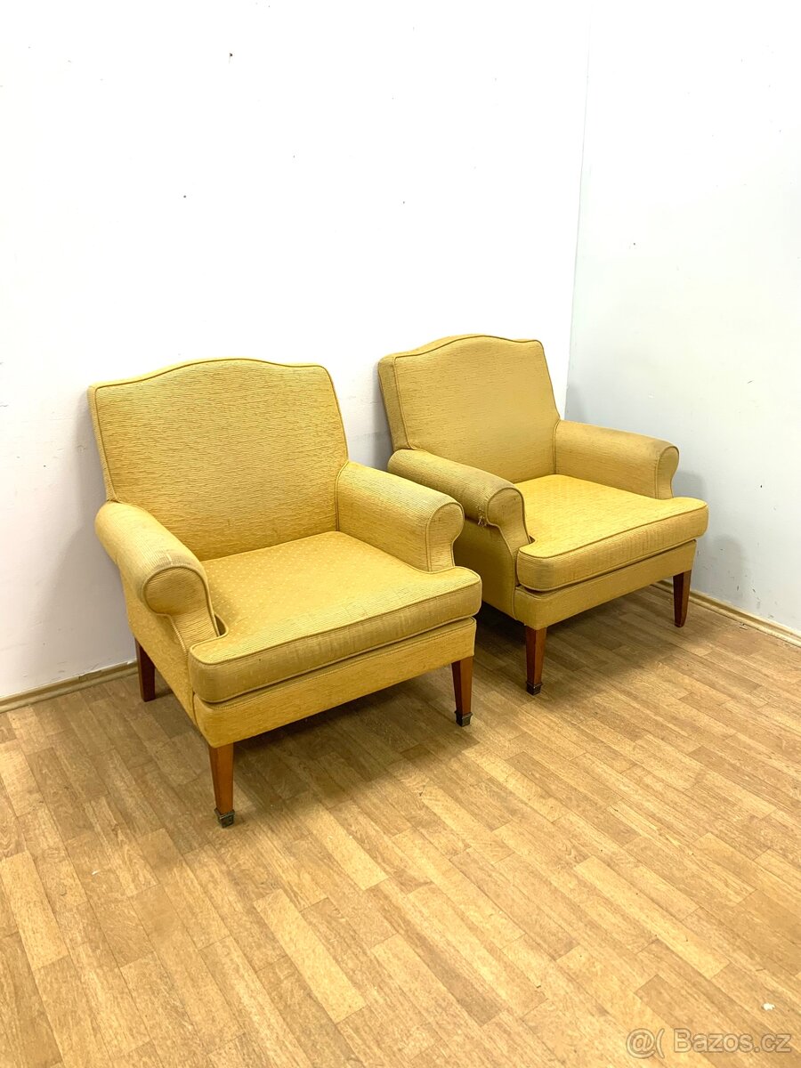 Prodávám stylová, velmi pohodlná retro křesla, výroba druhá polovina minulého století, dřevěné nožky, čalouněno dobovou látkou žlutá barva, snímatelná sedací matrace. Původní, zachovalý stav, čalounění k vyčištění, zachovalá. Cena 3800,-Kč za obě křesla, možnost dopravy, v případě zájmu šest set osm pět šest čtyři šest dva čtyři