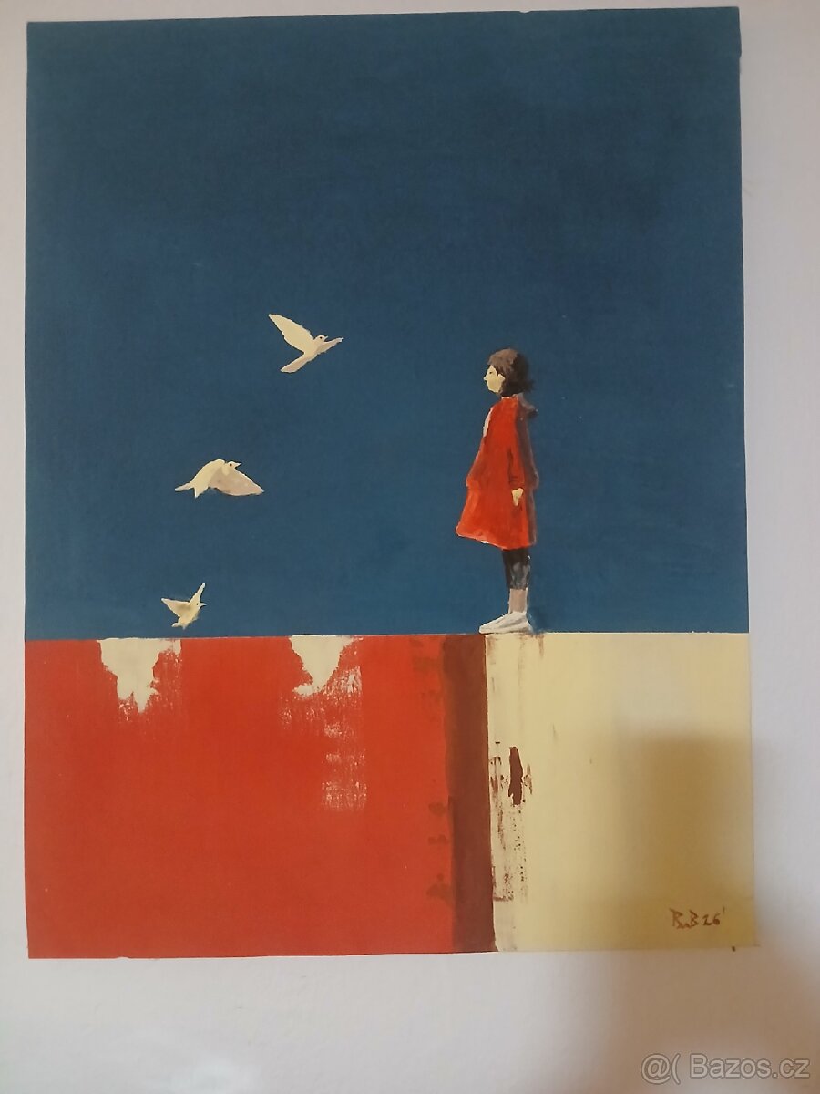 Minimalistická figurální kompozice s motivem postavy a ptáků. Obraz pracuje s kontrastem hluboké modré a výrazné červené plochy. Působí klidně, moderně a velmi silně v interiéru.