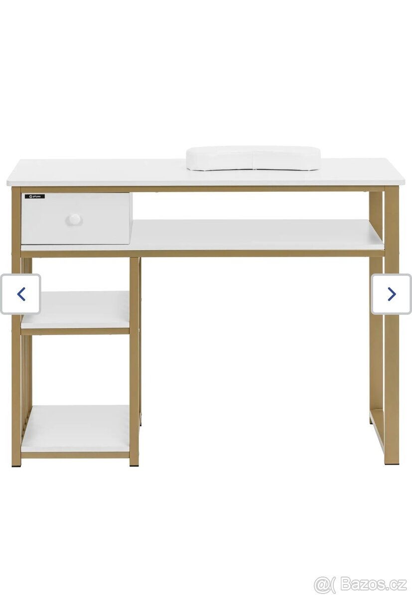Prodám zánovní stůl, vhodný jako psací nebo pracovní stůl. Šuplík je na pravé straně. Rozměry viz foto. železný rám - bílý / zlatý - zásuvka. Původní cena 4000 Kč. Osobní odběr Praha 9.