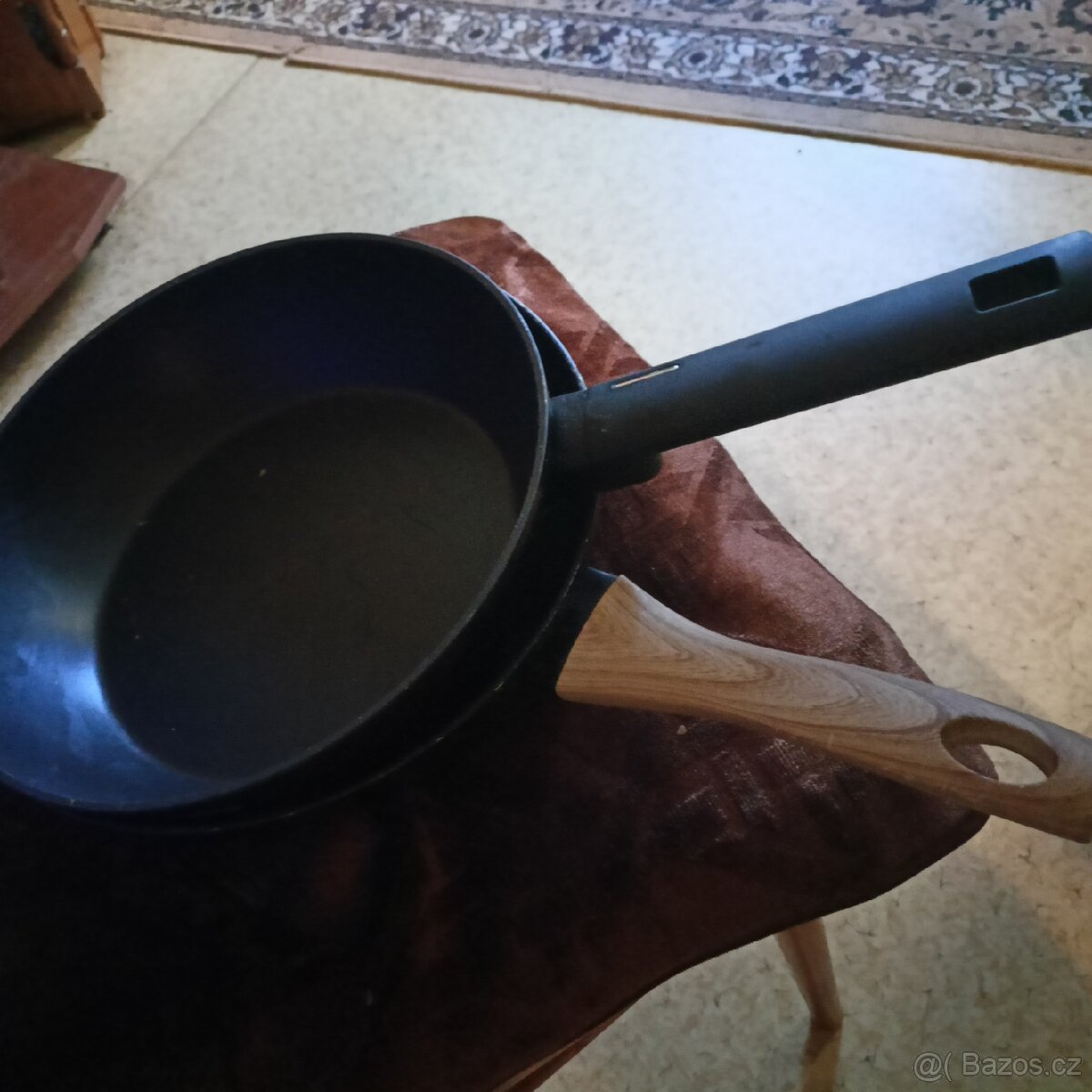 Obě jsou na indukci černá zn.vivess průměr 26,5cm,s dřevěnou rukojetí průměr 28cm,stav obě škrábance vevnitř zohledněno v ceně kus 100kc