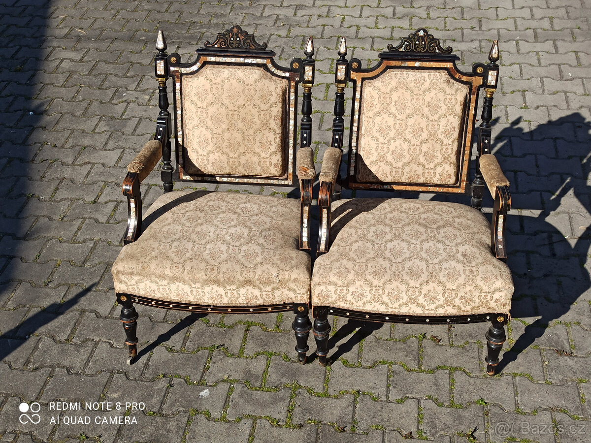 Prodám 2 starožitné židle, 2 křesla a taburet. V případě zájmu volejte na Tel.: 736762108