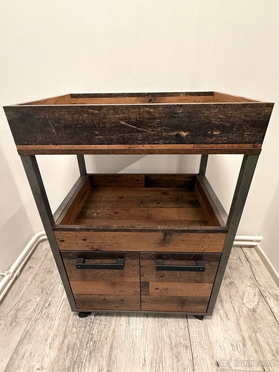 Rozměry: šířka 60 cm, výška 89 cm, hloubka 40 cm, dekor starého dřeva s dekorem betonu, laminový dřevěný materiál, původní cena 4000 Kč, jako nový, bez vad