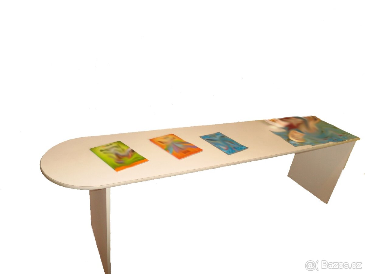 Prodám dlouhý bílý stůl vhodný jako prostorný psací stůl v dětském pokoji, nebo pro jednání s klienty (pojišťovna, cestovní kancelář a podobně).