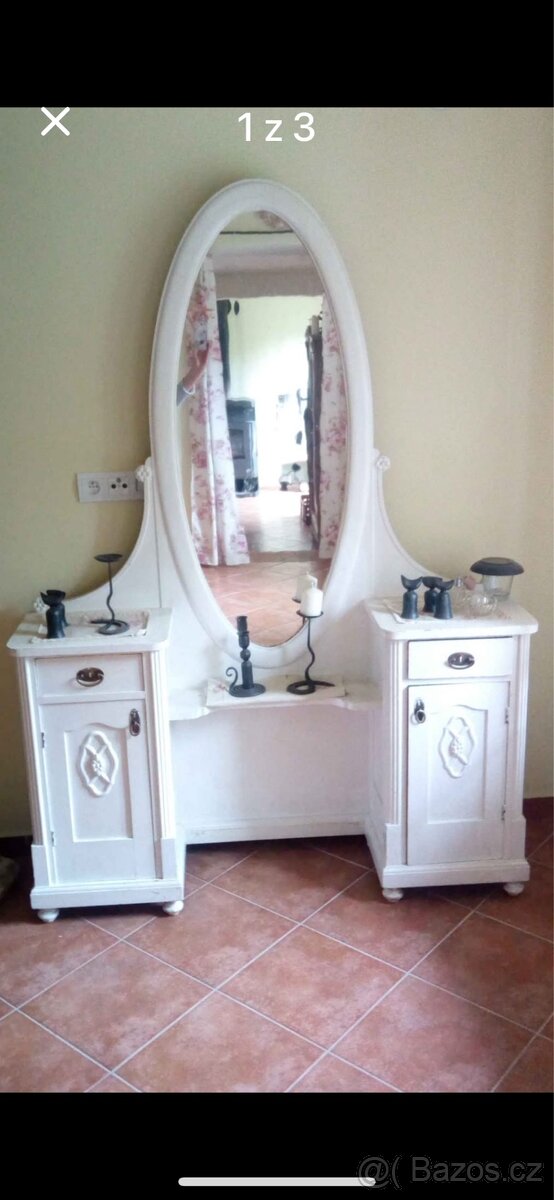 Komplet stará ložnice, zrcadlo, 2 skřínky, 2 postele a velká skříň. Skříň a postele jsou rozložené.