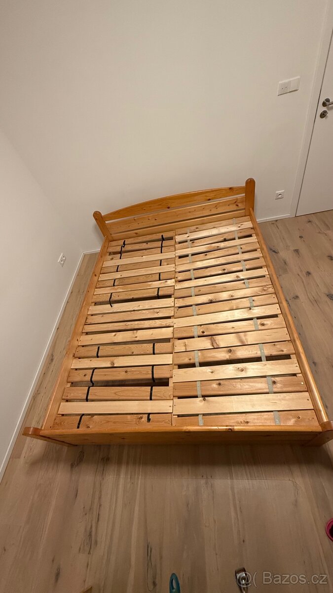 Manželská postel 180×200 cm s roštem – výborný stav - [27.4. 2026]Prodám manželskou postel o rozměru 180×200 cm. Konstrukce je z dřevotřískové desky laminované vysokotlakým laminátem, součástí je pevný dřevěný rošt.