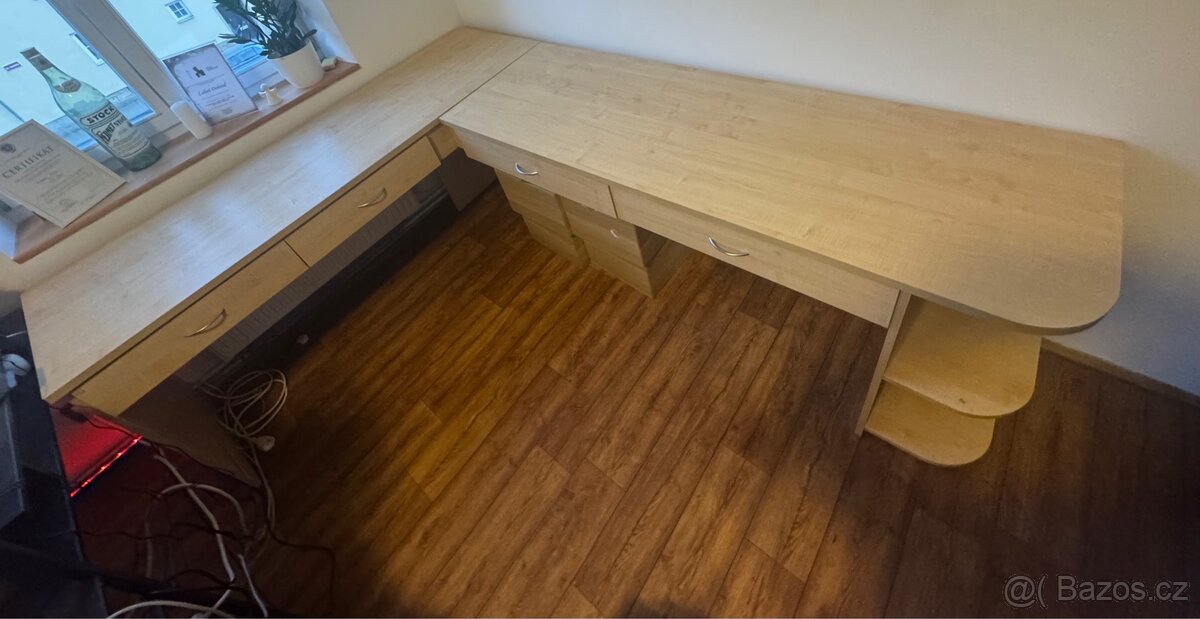 Stůl je pro dvě osoby má čtyři šuplíky a na jedné straně dvě poličky stůl je původně na míru a uprostřed spoje to je trošku oddělené ale drží dobře