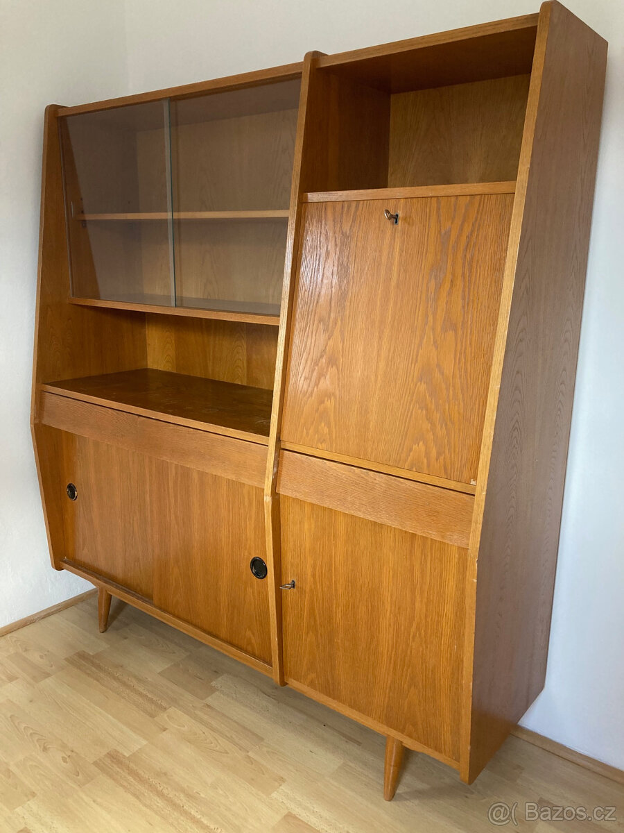 Retro obývací stěna / knihovna – 50.–60. léta – původní stav - [26.4. 2026]Prodám autentickou retro obývací stěnu z období 50.–60. let. Jedná se o dva samostatné moduly, které dohromady tvoří vyvážený a vizuálně výrazný celek.