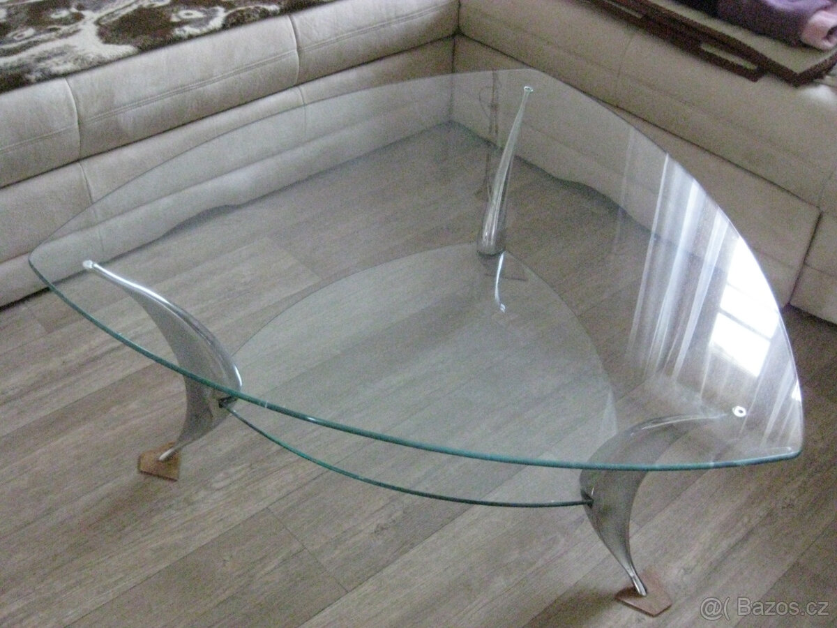 Konferenční skleněný stolek se silnými skly(10mm.) na kovových nohách. Výška 40cm. Průměr horního skla-100cm. spodního-60cm. Nepoškozen,ve velmi dobrém stavu. PC 5500,-