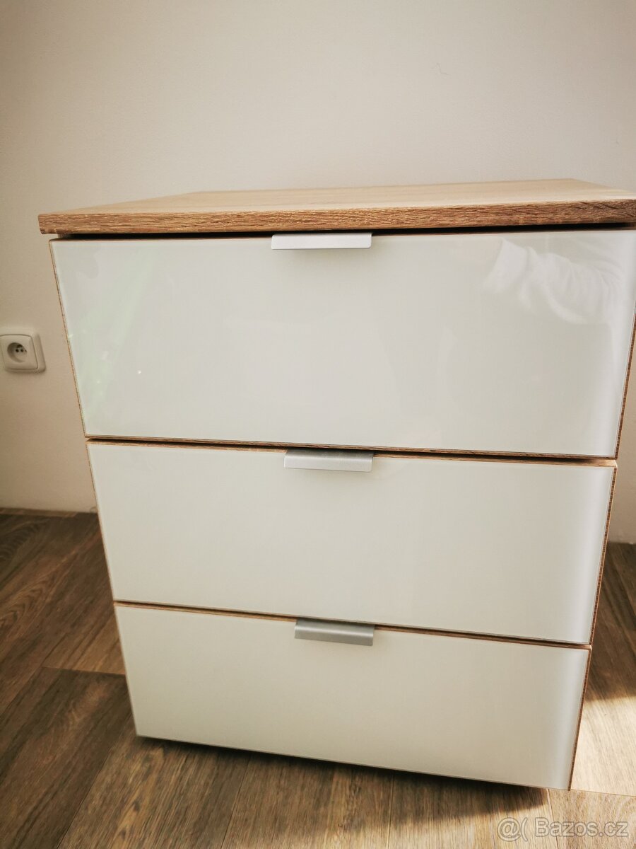 Nabízím k prodeji noční stolek. Používaný cca tři roky, v pěkném stavu. Kupovaný v XXXLutz cca za 4.500 Kč. Neposílám, na šuplíkách je čelo ze skla. Osobní odběr možný kousek od Chotěboře. Po domluvě mohu v týdnu dovést na trase Chotěboř, Golčův Jeníkov, Čáslav, Kolín; o víkendu do Benešova u Prahy.