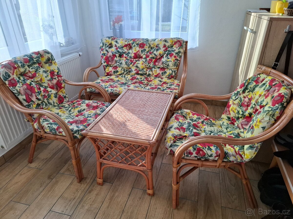 Prodám zachovalou sestavu ratanového nábytku - 2 křesla, 1 lavice, 1 stolek. V dobrém stavu, pouze sedáky jsou opotřebené.
