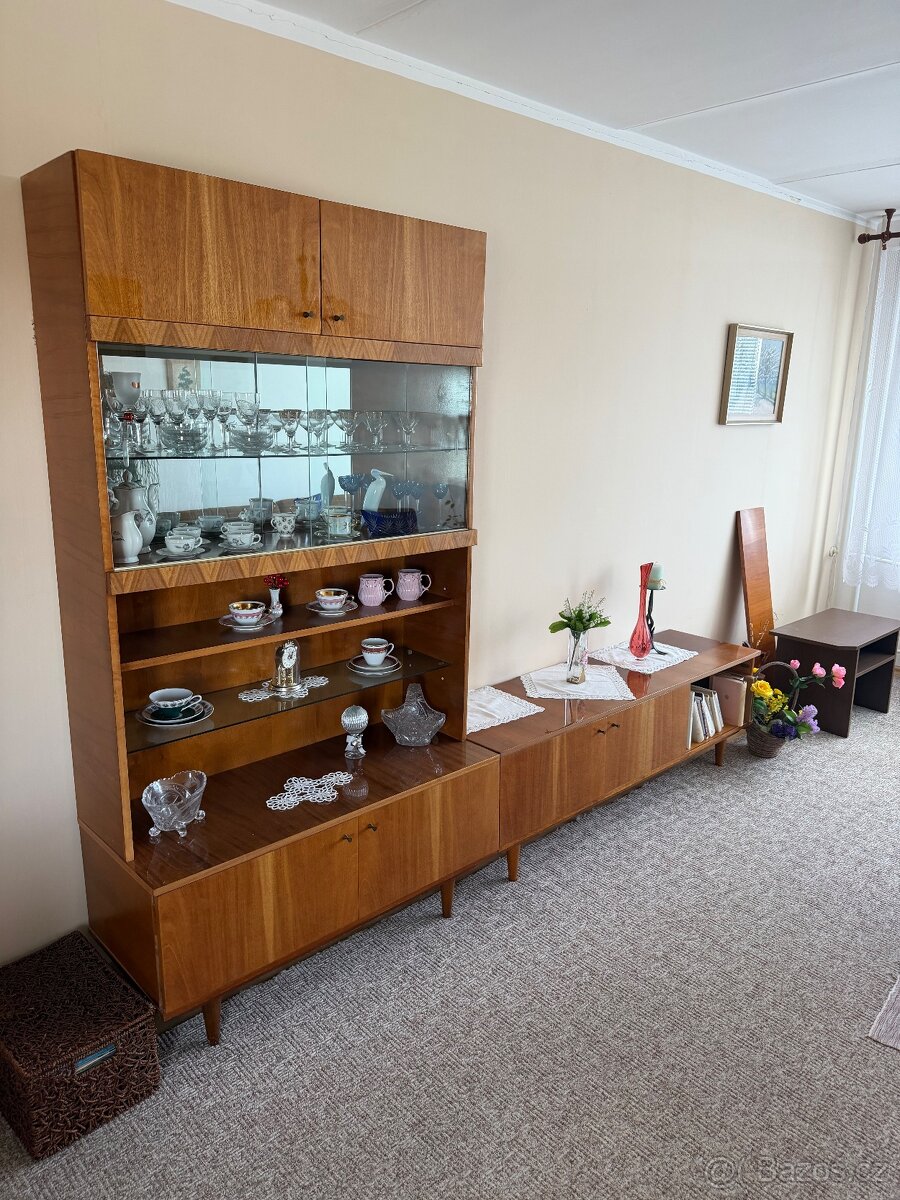 Prodám retro nábytek - [31.3. 2026]Prodám za symbolickou cenu, skříň na první fotce je dvakrát !! Stěna bude bez věcí na poličkách plus je k sestavě ještě peřiňák který chybí na fotce u stěny chybí na jedné straně skleněné dveře jsou upadlé možnost je ke stěně přidat a opravit si. Ně ...