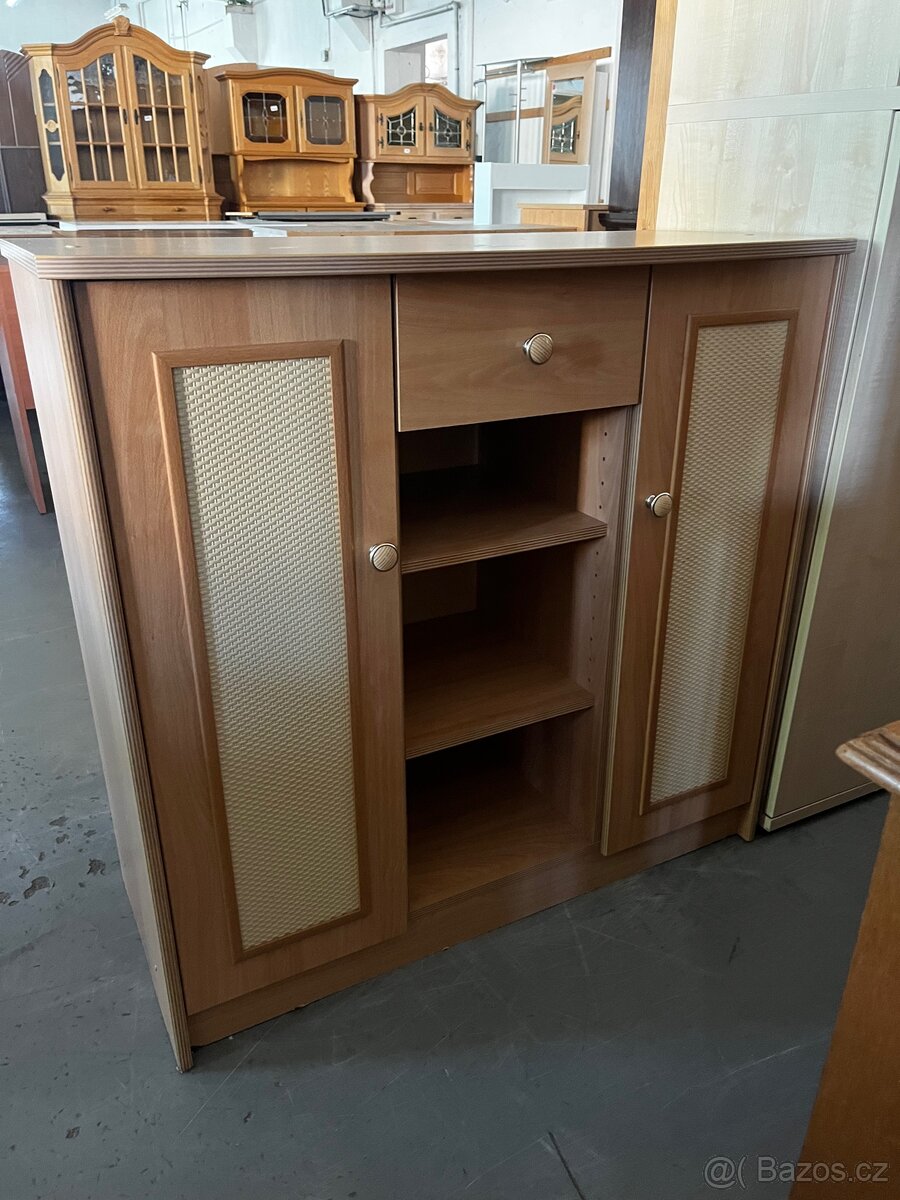 Prodám praktickou komodu v dekoru dřeva. Skříňka má dvě uzavíratelné části po stranách, uprostřed otevřený prostor s policemi a nahoře jednu zásuvku.