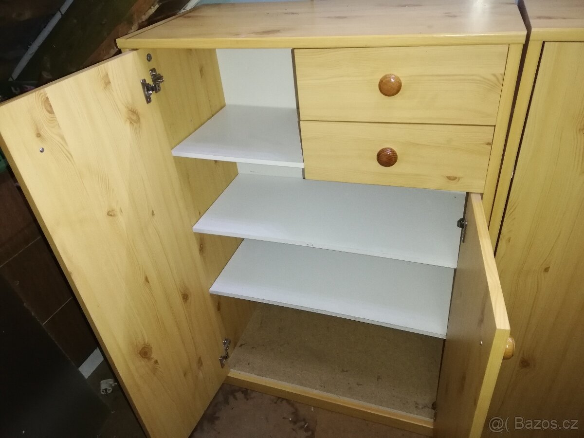 Nabízím skříňky, botniky... Dřevotříska lamino dekor světla Borovice. Skříňka je už rozložena a připravena k transportu. Vejde se do osobáku. Mám dva kusy. Rozměry SxVxH. Jedna ta menší 70x110x36cm. Druhá větší 118x110x36cm. Cena za obě 1000kc. Nebo po 500kc.