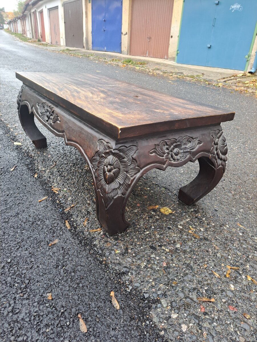 Prodám moc pěkný starožitný, vyřezávaný stolek indického stylu. 103x50 V40 cm. Osobní předání v Příbrami. Platí do smazání..