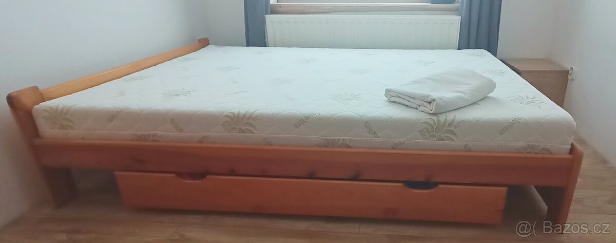 Velká postel s matrací a roštem - [29.4. 2026]Prodám postel s roštem a matrací, rozměry postele: 210x110, rozměry matrace: 200x100, materiál masivní borovice, matrace GUMOTEX.