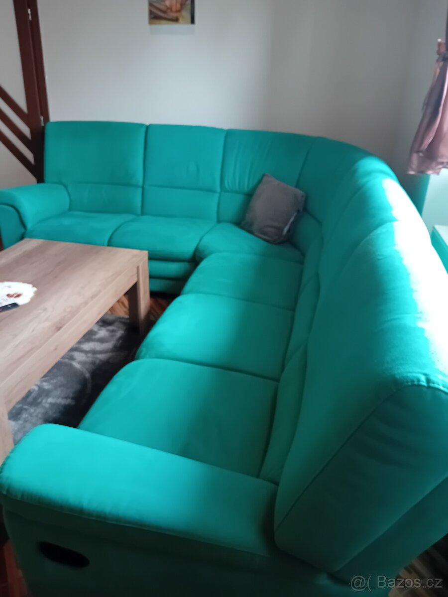 Nabízím k prodeji prostornou a velmi pohodlnou rohovou sedací soupravu v moderní smaragdově-tyrkysové barvě. Sedačka je výrazným designovým prvkem a díky svému tvaru krásně zaplní roh místnosti.