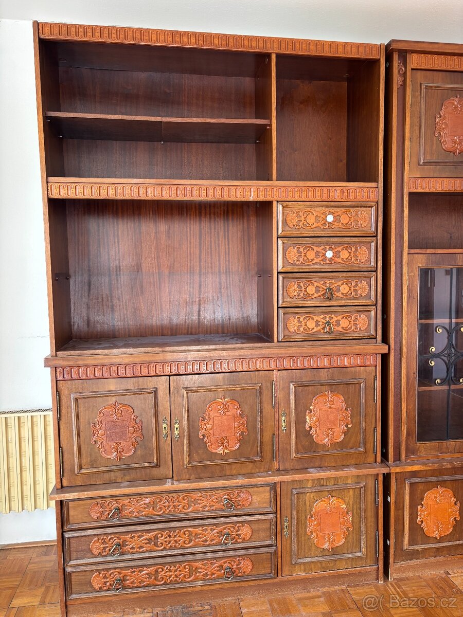 Starožitná obývací stěna,dekor kořenice - [21.4. 2026]Obývací stěna+skříň.Stav viz foto.Nutny vlastní odvoz z Tvarožné u Brna.