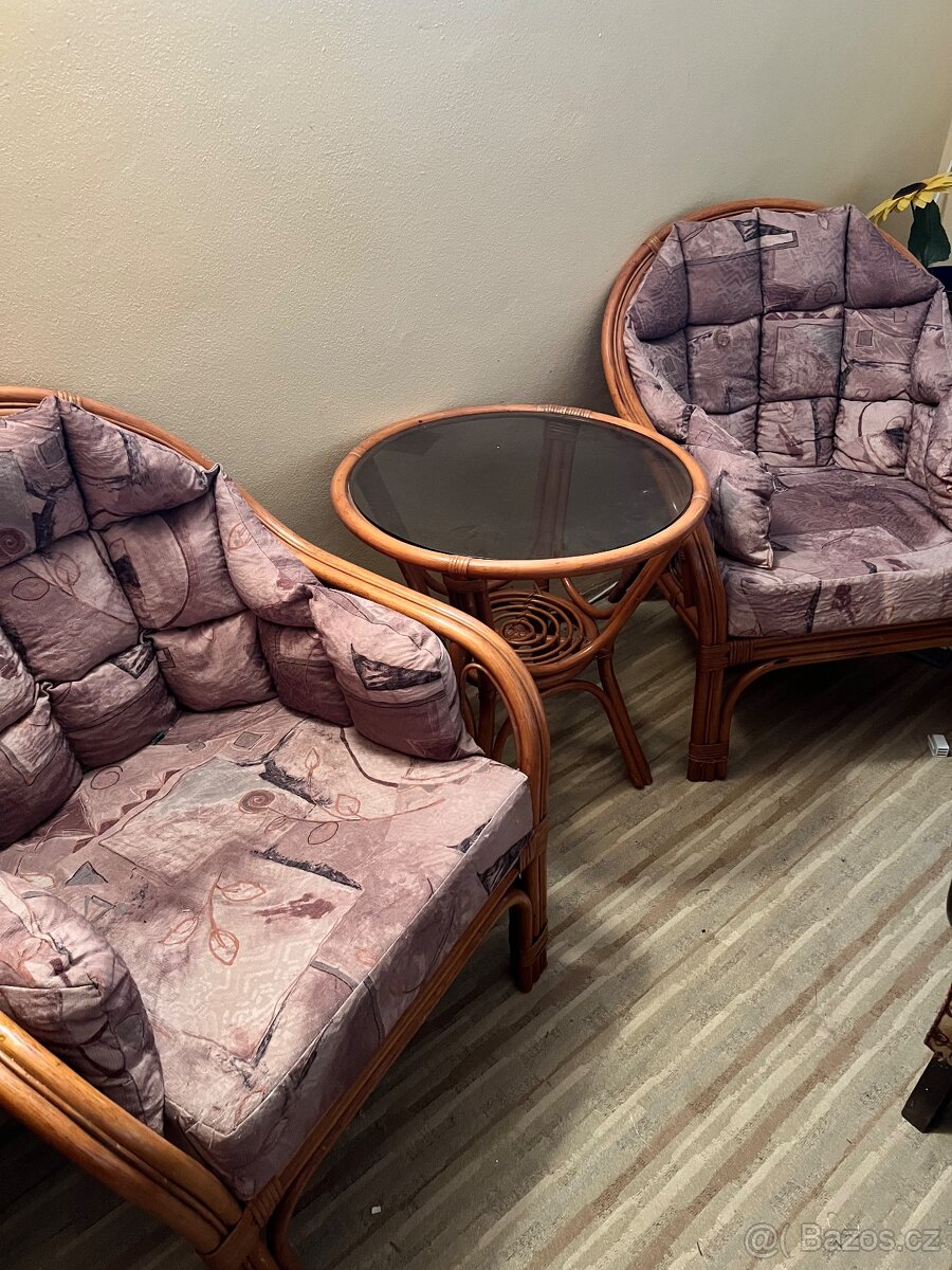 Prodám sedací soupravu 2+1 s kulatým stolkem /uprostřed sklo/ z přírodního ratanu včetně polstru. Souprava je zachovalá, používaná pouze v interieru , pevná konstrukce, ratan nepopraskaný ani vyšisovaný. Cena 4000,-Kč